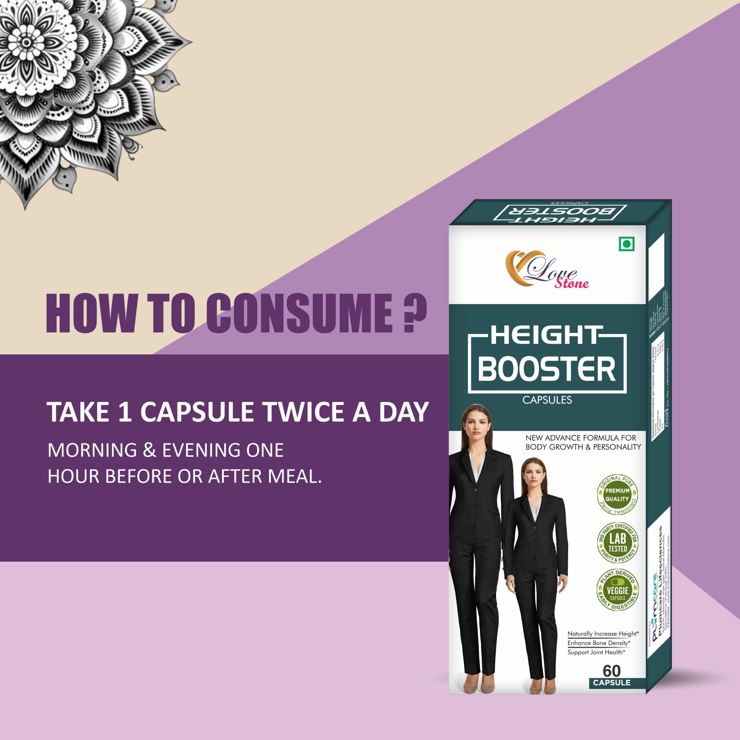 Achieve your desired height with LOVE STONE Height Booster Capsules, crafted for effective height growth and overall body support. Suitable for men, women, girls, and boys, this powerful formula enhances bone density, promotes muscle and joint health, and boosts body growth naturally.